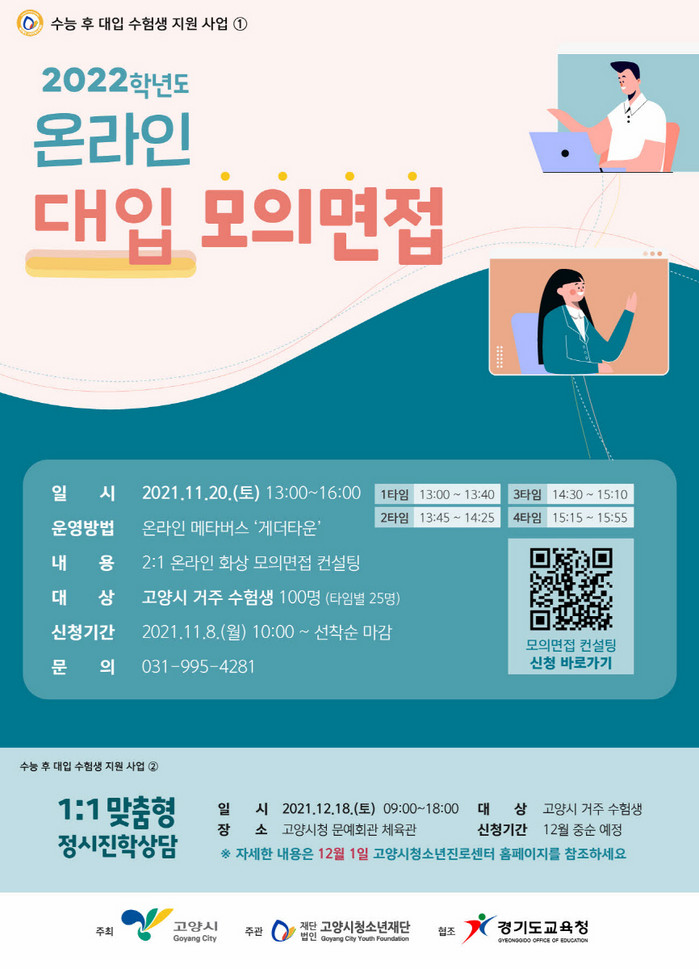 이어 12월 18일(토) 고양시청 문예회관 체육관에서 경기도 교육청 대입진학 전문 상담교사가 참여하는 1:1 맞춤형 정시 진학상담이 실시된다. 자세한 내용과 일정은 12월 1일 고양시청소년진로센터 홈페이지에 게시될 예정이다.