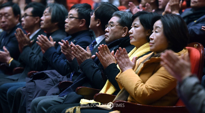 추미애 더불어민주당 대표와 심상정 정의당 대표, 이재정 교육감 등 내빈들이 9일 오후 경기 안산문화예술의전당 해돋이극장에서 열린 세월호 참사 1000일 공식 추모 행사에 앞서 박수를 치고 있다. 2017.01.09