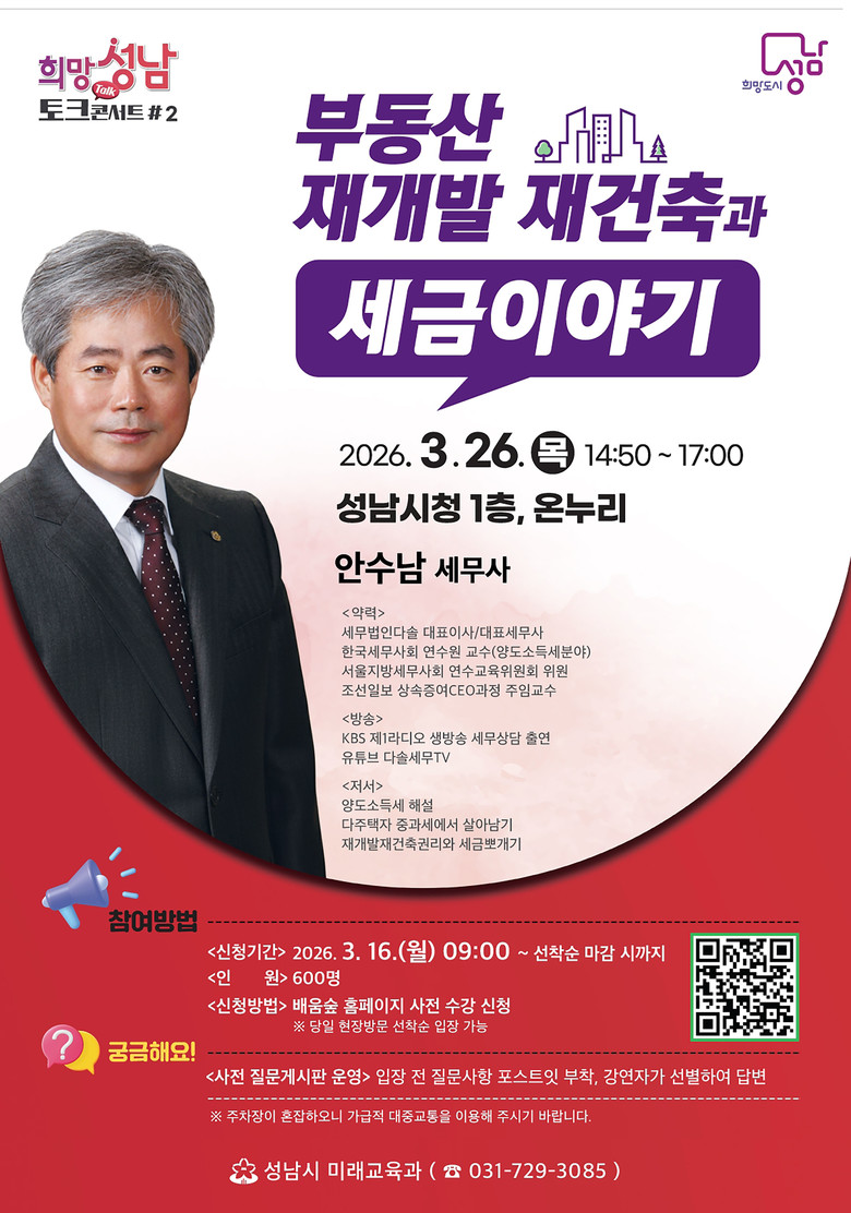 시는 이날 강연자로 안수남 세무법인다솔 대표이사(세무사)를 초빙한다.