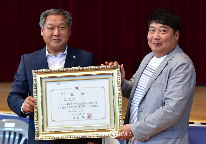[부여=부자동네타임즈 이현석 기자] 이용우 부여군수가 지난 11일 부여군 유도발전에 기여한 공로로 대한유도회로부터 명예 4단증을 받았다.