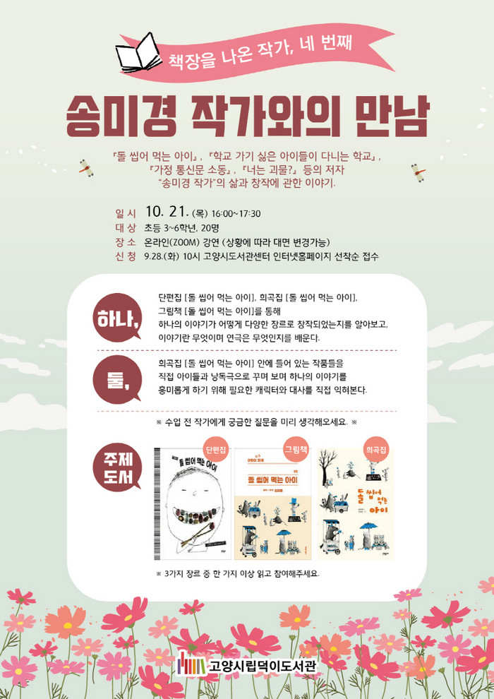 [부자동네타임즈 김인수기자] 고양시 덕이도서관이 오는 10월 21일 ‘송미경 작가와의 만남’을 운영한다.