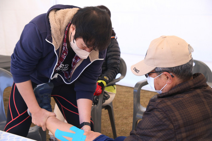 [사진설명] 고려대스포츠과학연구소, 한국스포츠문화예술재단 엄성흠이사장이 걷기대회 참가한 시민들에게 테이핑을 해주고 있다.