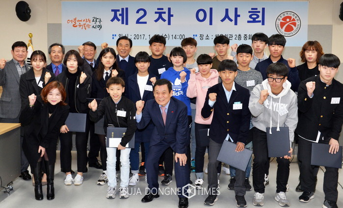 | △윤장현 광주광역시장이 '제2차 이사회'에 참석해 체육인재 장학금을 수여한 후 기념촬영을 하고 있다 |
