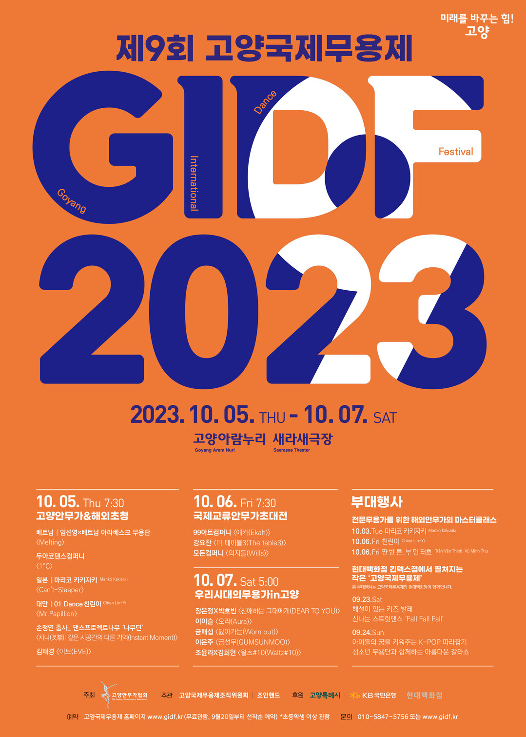 본 행사는 10월 5일 고양특례시 대표 안무가의 공연과 해외초청작으로 축제의 화려한 개막식을 올린다. 10월 6일 ‘국제교류 안무가 초대전’에서는 세계 무대를 넘나들며 실력을 검증받은 대한민국 대표 안무가의 작품이, 10월 7일 ‘우리 시대의 무용가 인(in) 고양’은 중견 및 신진 무용가까지 각 세대를 대표하는 춤꾼의 무대가 시민과 만날 예정이다.
