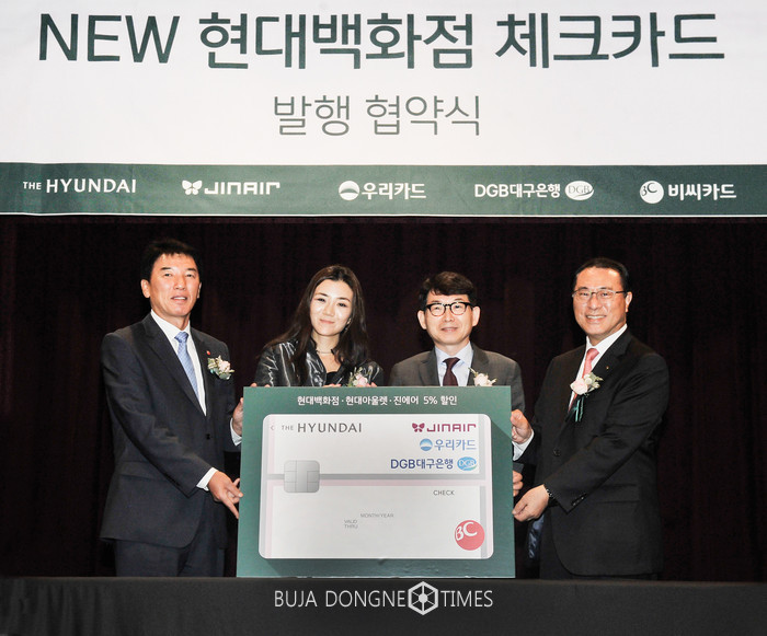지난 12일 오후 3시 현대백화점 무역센터점에서 진행된 ‘NEW 현대백화점 체크카드’ 출시를 위한 협약식에는 채종진 BC카드 사장, 유구현 우리카드 사장, 박동운 현대백화점 대표, 조현민 진에어 부사장 등이 참석한 가운데 진행됐다.
