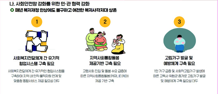 시는 복지사각지대를 최소화하기 위해 시대의 변화에 따른 복지수요에 대응하여 신규정책을 개발하고 취약계층을 찾고 이들에게 필요한 정책을 마련할 계획이다. 초고령사회 진입에 따른 어르신 돌봄수요, 1인 가구 및 사회적 고립가구 증가, 지역사회통합돌봄 체계 등 지속적으로 변화하는 시대환경, 새로운 복지수요에 대응하는 역할도 기대된다.