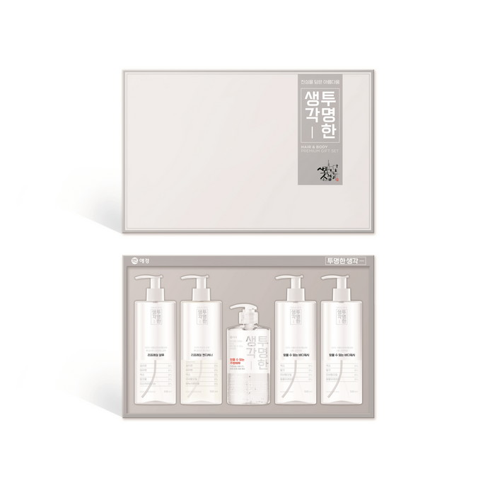‘투명한 생각 스페셜 선물세트’는 기존 선물세트와 달리 제품명 그대로 투명한 용기에 전성분 표기와 함량까지 공개해 제품의 성분을 눈으로 확인할 수 있는 프리미엄 선물세트이다. 특히 전 구성품이 100% 식물유래 계면활성제를 함유, 성분에 민감한 사람이나 자녀가 있는 가정을 위한 선물로 좋다.