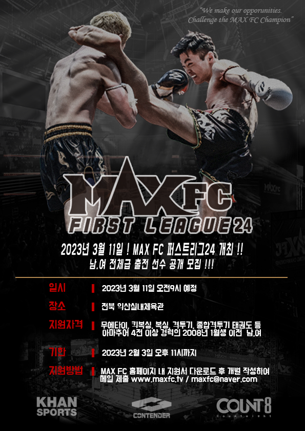 한편 ‘MAX FC 퍼스트리그 24’와 관련된 자세한 정보(출전 신청 및 일정 등)는 MAXFC 공식 홈페이지에서 확인할 수 있다.