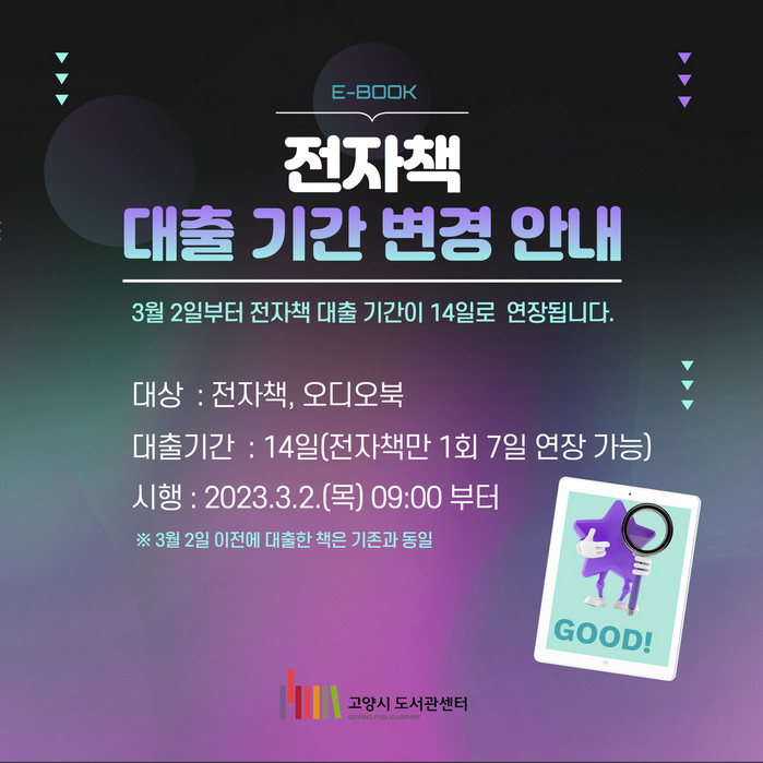 [부자동네타임즈 김인수기자] 고양특례시(시장 이동환) 도서관센터가 오는 3월 2일부터 전자책·오디오북 대출 기간을 기본 14일로 늘린다.