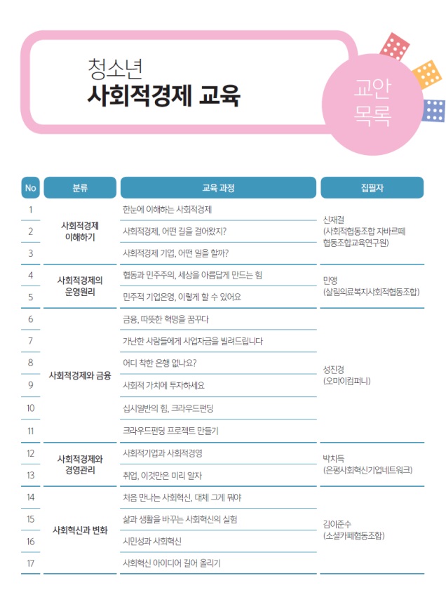 교재제작이 주민참여예산이라는 측면을 고려해 사회적경제기업 주체들이 직접 참여해 만들 수 있도록 하는 참여형 청소년 사회적경제교재로 만들었다. 이러한 참여로 기본과정 뿐만 아니라 기업이 수업할 수 있는 기업과정으로 구성해 이론과 현장 교육이 적절하게 조화되었다.