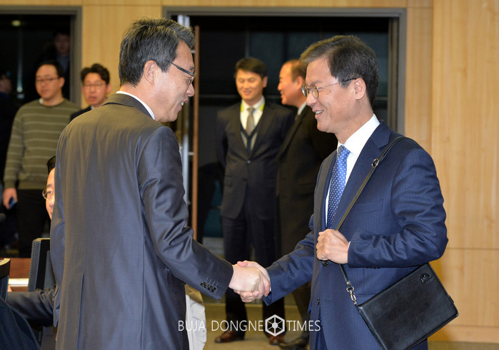 1일 오전 서울 여의도 국회 의원회관에서 열린 국민의당 제3차 정책강화 국회의원 워크숍에 참석한 천정배(오른쪽) 전 대표와 김성식 의원이 인사를 나누고 있다. 2017.02.01.