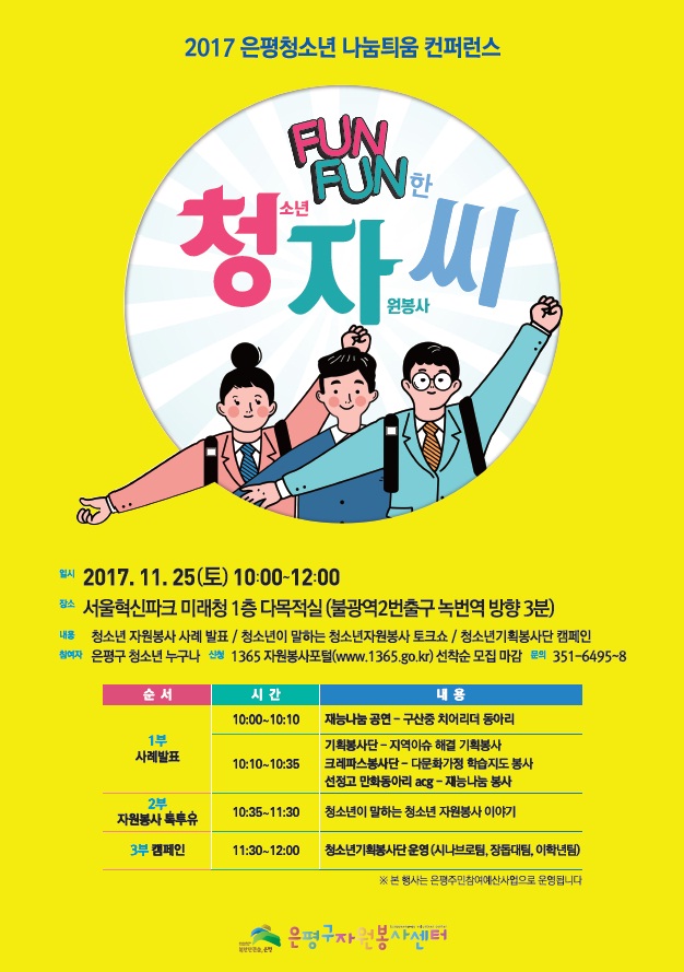 [부자동네타임즈 이병도 기자]은평구는 11월 25일(토) 오전 10시 서울혁신파크 미래청 1층 다목적실에서 2017. 청소년 나눔틔움 컨퍼런스 ‘Fun Fun한 청소년자원봉사씨’를 개최한다.