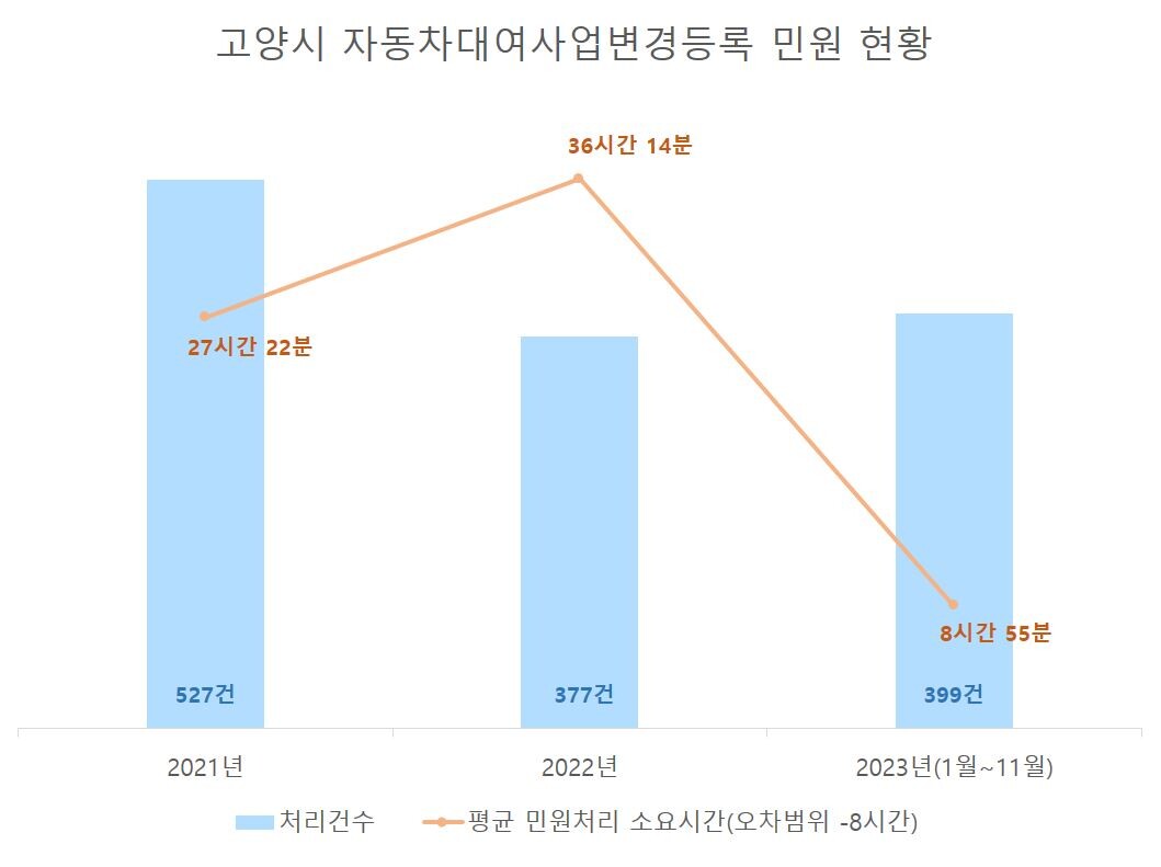 특히, 올해는 ‘자동차대여사업 변경등록’ 민원 처리의 신속도에 대한 만족도 지표가 상승했다. 고양시 버스정책과에서 처리하는 민원처리의 평균 소요시간은 2021년 27시간 22분, 2022년 36시간 14분이었으나, 올해는 8시간 55분으로 나타났다. 버스정책과는 민원 접수 즉시 서류를 검토하여 바로 처리하는 등 신속한 민원처리를 위해 노력하고 있다.