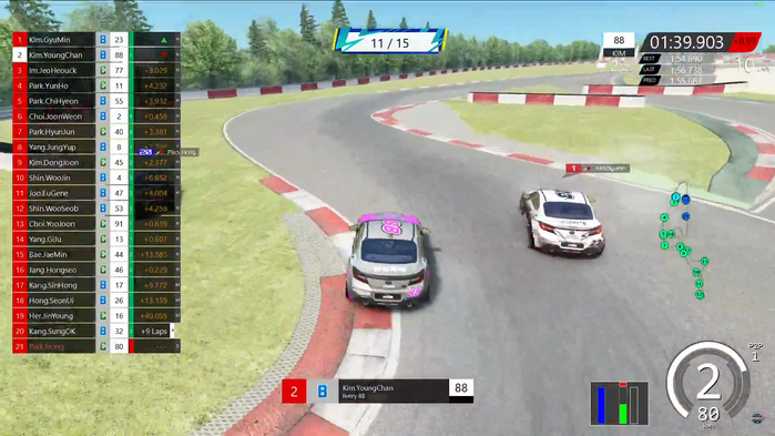 10 LAP에서 김영찬(21) 선수가 김규민(20) 선수 뒤에 바짝 따라붙으면서 기회를 노려보았으나 김규민(20) 선수의 블로킹에 의해 실패했다. 11 LAP에서 한번 더 기회를 노려본 김영찬(21) 선수는 순간적으로 진행 방향을 틀면서 김규민(20) 선수를 완벽하게 속여 순식간에 1위로 올라서는 모습을 보여주었다. 중계진은 김규민(20) 선수도 사람이라며 김영찬(21) 선수의 전략에 감탄하였다.