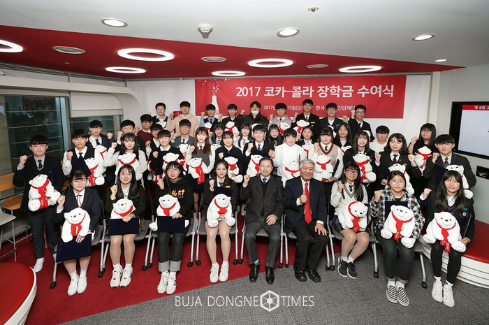 [부자동네타임즈 김현정 기자]코카-콜라 청소년건강재단이 지난 15일 서울 신문로 소재 한국 코카-콜라 사옥에서 ‘제8회 코카-콜라 장학금’ 수여식을 개최하고 청소년 40명에게 장학금을 전달했다.