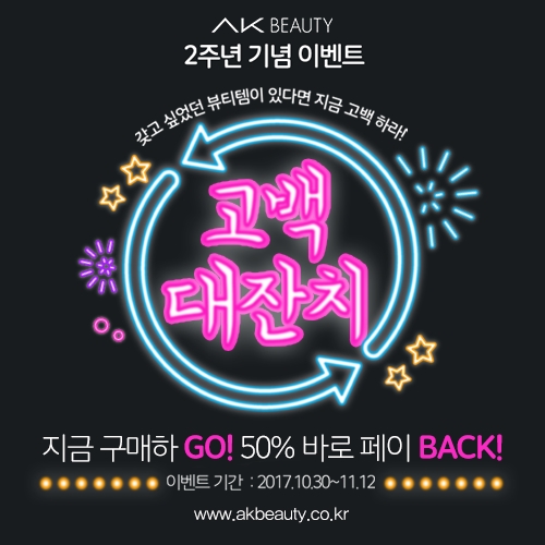 [부자동네타임즈 김현정 기자]생활뷰티기업애경(대표이사고광현)에서운영하는토털뷰티온라인직영몰 ‘AK BEAUTY’(http://akbeauty.co.kr)에서오픈 2주년을기념해구매금액의 50%를돌려주는사은행사를진행한다.
