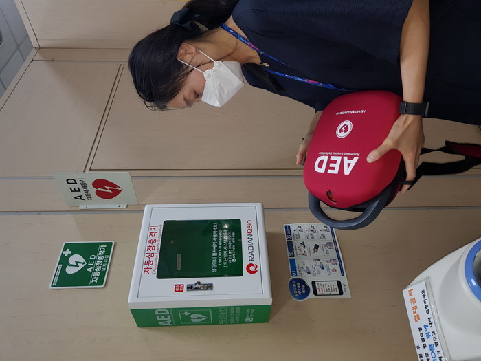 [사진설명] 자동심장충격기(AED) 점검하고 있다.