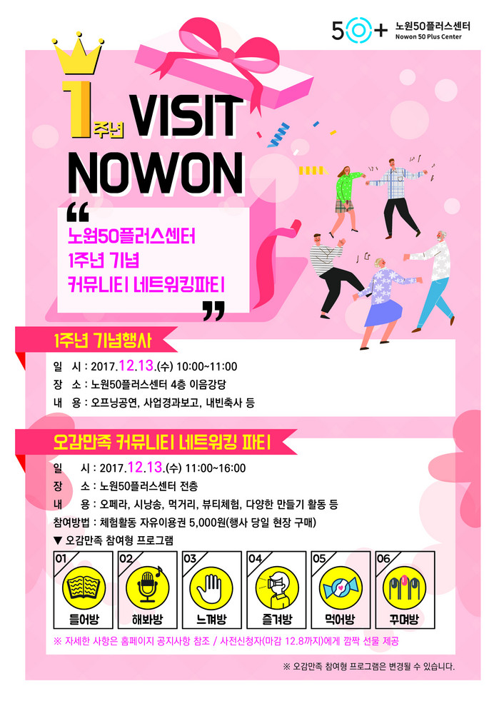 ‘VISIT NOWON'을 주제로 진행될 이번 기념식에는 김성환 구청장을 비롯해, 50+커뮤니티, 이용자 등 약 100여명이 참석할 예정이다. 이날 사회는 노원50+센터 시니어 희망설계 커뮤니티 김강수 대표가 진행하며 ▲ 1주면 기념영상 ▲ 센터 운영보고 ▲ 50+커뮤니티 축하공연 ▲ 기념 떡케익 커팅식 순으로 진행된다.