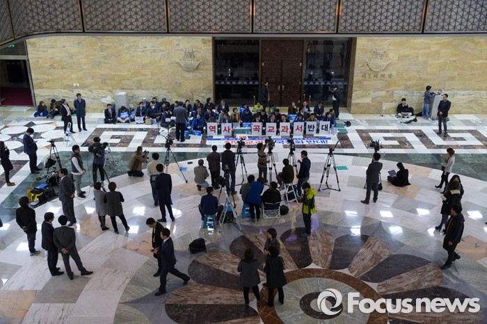 | △ 2일 오후 국회 본청 로텐더홀에서 새정치민주연합 대표를 비롯한 의원들이 친일교과서 국정화 반대 철야농성에 돌입하고 있다. 허란 기자 huran79@focus.kr |