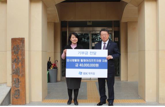 [부자동네타임즈 이현재 기자]IBK캐피탈(이상진 대표)은 지난 11월 1일 서울 강동구 암사재활원에 장애인용 휠체어리프트 차량 구입대금 4,000만원을 전달했다고 밝혔다.