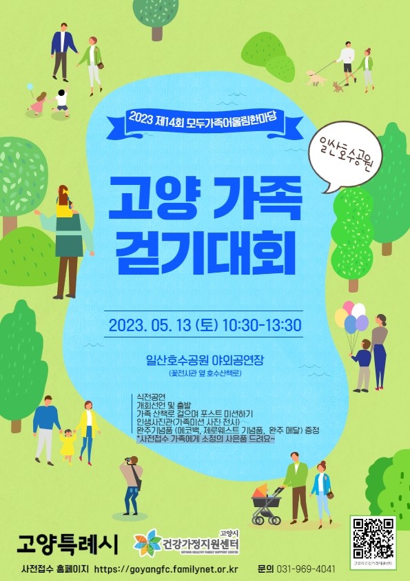 이날 ▲일산호수공원 산책 ▲가족 인생사진 찍기·인생 사진관 ▲가족 OX퀴즈 ▲가족사랑 핸드페인팅 등 다채로운 프로그램이 진행된다. 산책을 완주한 가족에게는 완주 메달과 소정의 기념품을 증정된다.