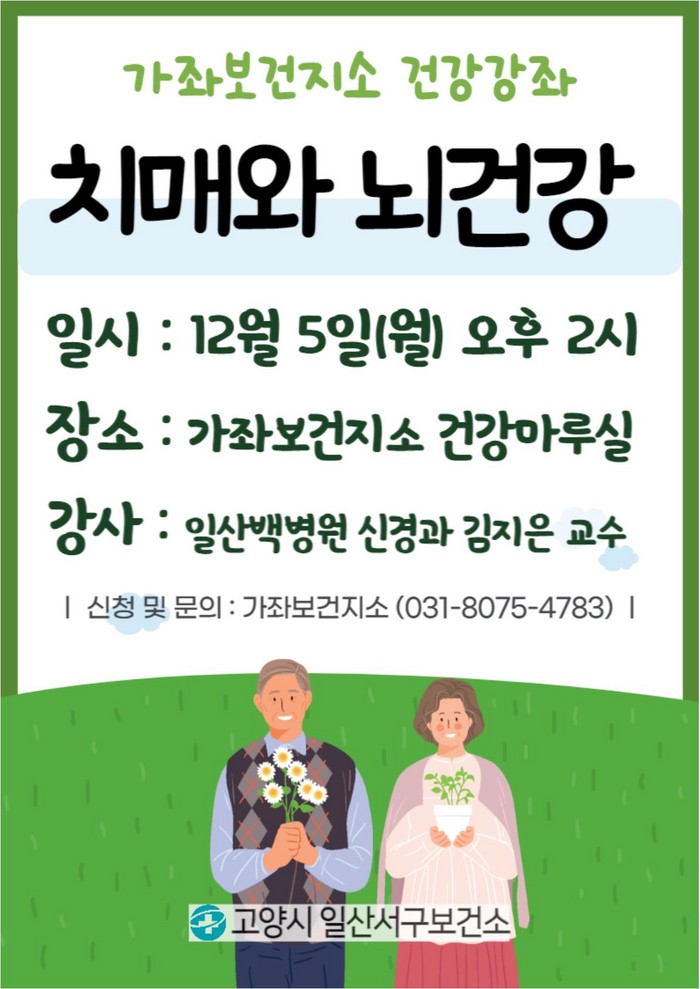 [부자동네타임즈 김인수기자] 고양특례시(시장 이동환) 일산서구보건소가 12월 5일(월) 오후 2시 가좌보건지소에서 ‘치매와 뇌건강’ 건강강좌를 운영한다. 강의는 일산백병원 김지은 교수가 맡는다.