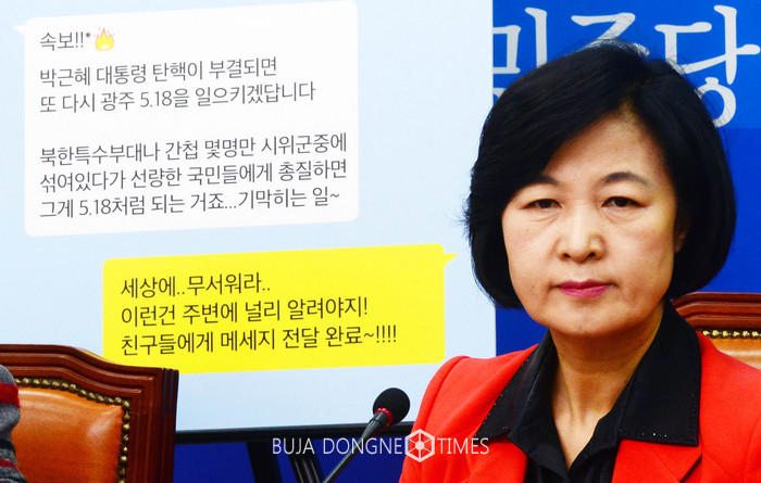 18일 오후 서울 여의도 국회 더불어민주당 당대표실에서 열린 최고위원회의에서 추미애 대표 뒤로 SNS에 올라온 악성유언비어 내용이 보이고 있다. 더불어민주당은 악성유언비어에 강경대응하겠다고 밝혔다. 2017.01.18.
