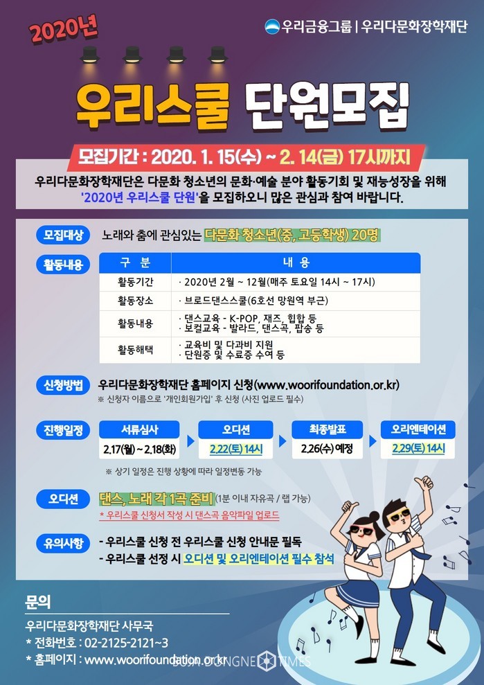 [부자동네타임즈 이현재 기자]우리금융그룹 우리다문화장학재단은 다문화 청소년 문화‧예술교육‘2002년 우리스쿨’참여자를 모집한다고 29일 밝혔다.