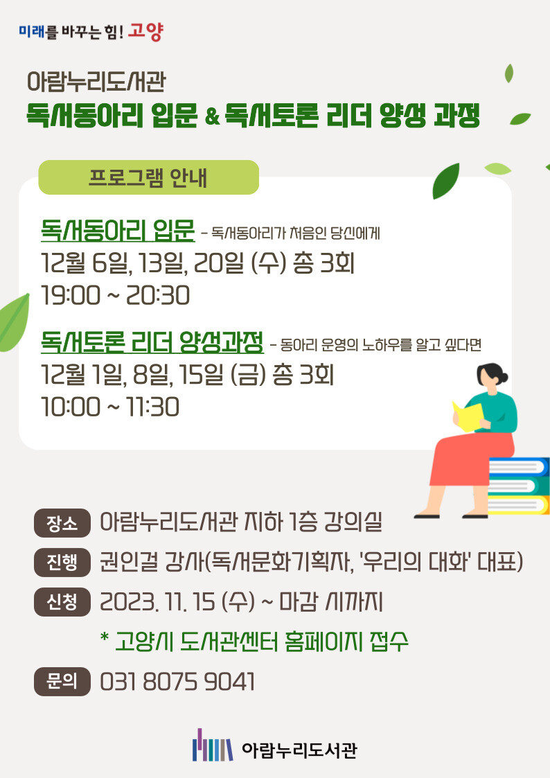 참여를 희망하는 시민은 11월 15일부터 고양시립도서관 누리집에서 참가 신청하면 된다. 자세한 사항은 아람누리도서관으로 전화(☏031-8075-9041)로 문의하면 된다.