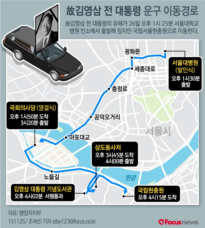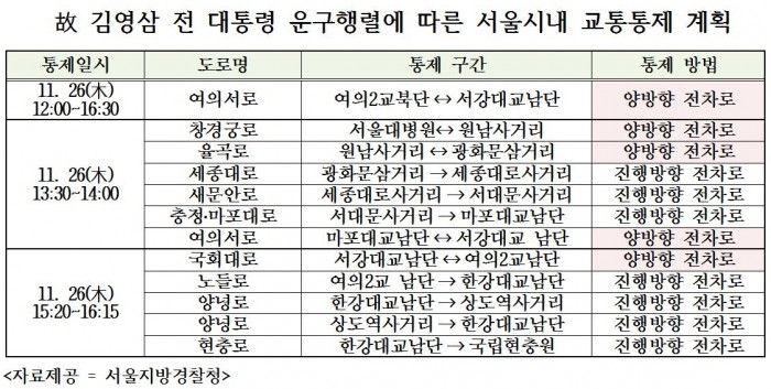 [부자동네타임즈 이영진 기자] 26일 고(故) 김영삼 전 대통령의 영결식이 진행되는 가운데 운구행렬 경로에 따라 이날 오후 서울시내 일부 구간의 교통이 통제된다.