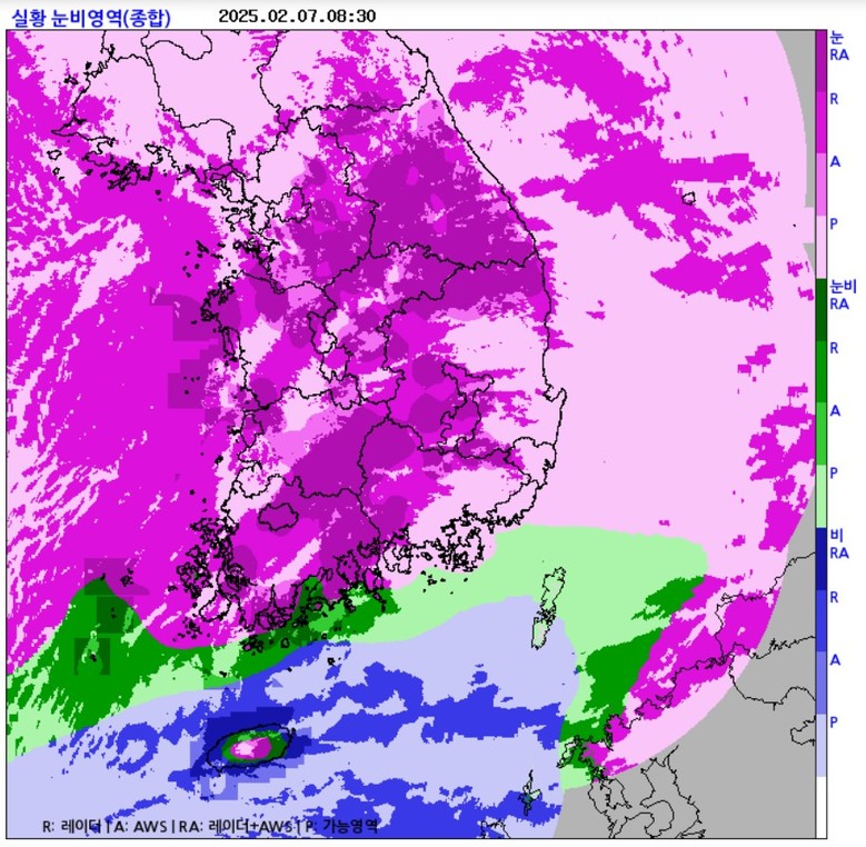 7일 오전 8시 30분 레이더 눈비 영역. [기상청 제공]