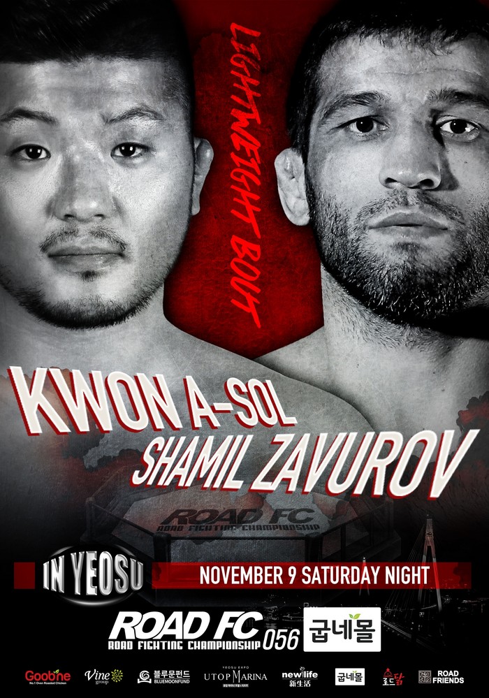 [부자동네타임즈 김인수기자] 굽네몰 ROAD FC 056은 2010년 출범한 ROAD FC의 대회 최초로 전라도 여수에서 열린다. 전라도 목포 출신의 권아솔이 ‘하빕 사촌 형’ 샤밀 자브로프와 대결해 큰 관심을 모으고 있다. 이외에도 ‘밴텀급 챔피언’ 김민우가 1차 방어전을 장익환과 치러 밴텀급 타이틀의 향방이 결정된다.
