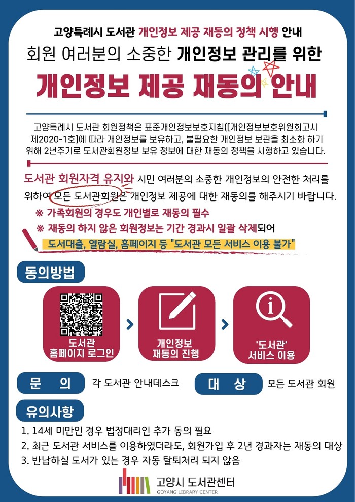 개인정보 제공 재동의는 고양시도서관센터 홈페이지에서 할 수 있다. 대상자일 경우 로그인하면 자동으로 재동의 페이지로 안내되며 재동의 기간이 도래하지 않은 경우에도 ‘나의 도서관→개인정보 동의 만료일’에서 기간을 연장할 수 있다.
