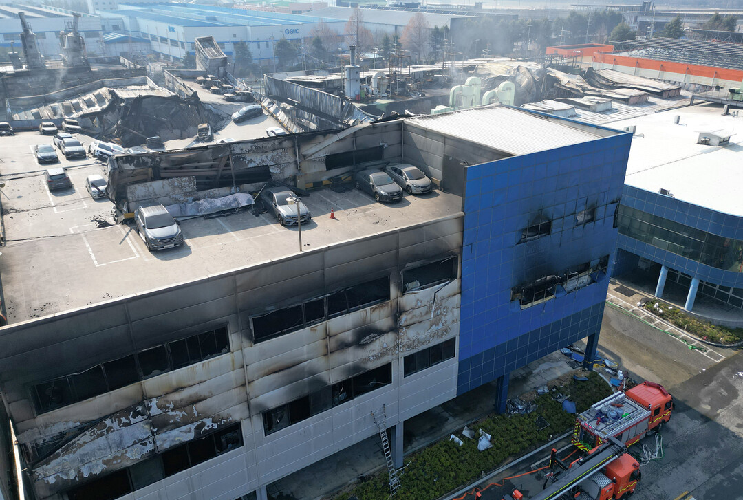 대형 화재가 발생한 대전 대덕구 안전공업 외관을 21일 오전 하늘에서 바라본 모습. 2026.3.21