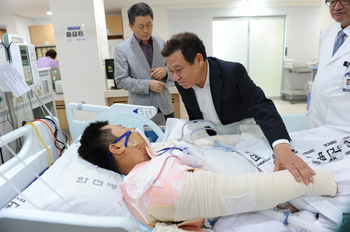 | △ 서울 한전병원에서 치료 중인 노석훈 소방장을 찾아 위하고 있는 윤장현 시장. |