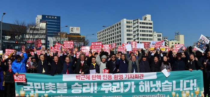장휘국 교육감은 10일(금) 오전 5·18민주광장에서 생중계로 헌법재판소 탄핵심판 결과를 윤장현 시장과 임추섭 대표, 정영일 대표 등 시민들과 함께 지켜봤고 탄핵 인용의 선고가 나오자 환영을 절을 올렸다.