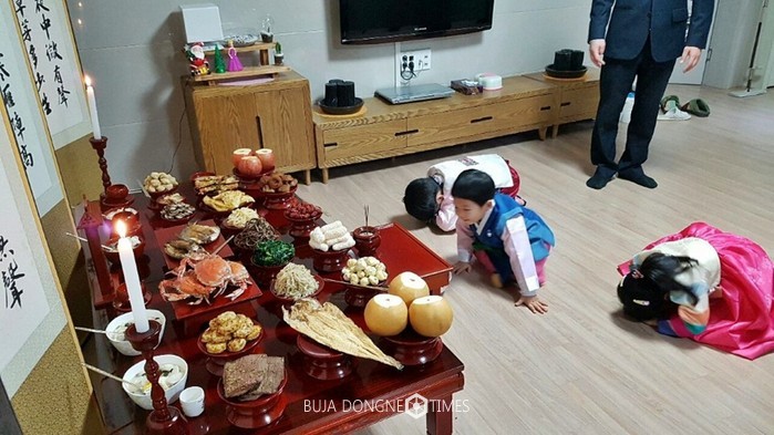 설 명절인 28일 전북 익산시의 한 가정에서 어린 아이들이 조상을 위해 마련한 차례상에 절을 하고 있다. 2017.01.28. (사진=시민 제공)
