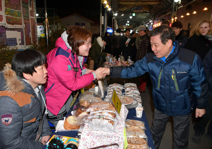 윤장현 광주광역시장이 18일 저녁 첫 개장한 대인예술야시장을 찾아 상가를 둘러보고 상인들을 격려하고 있다.