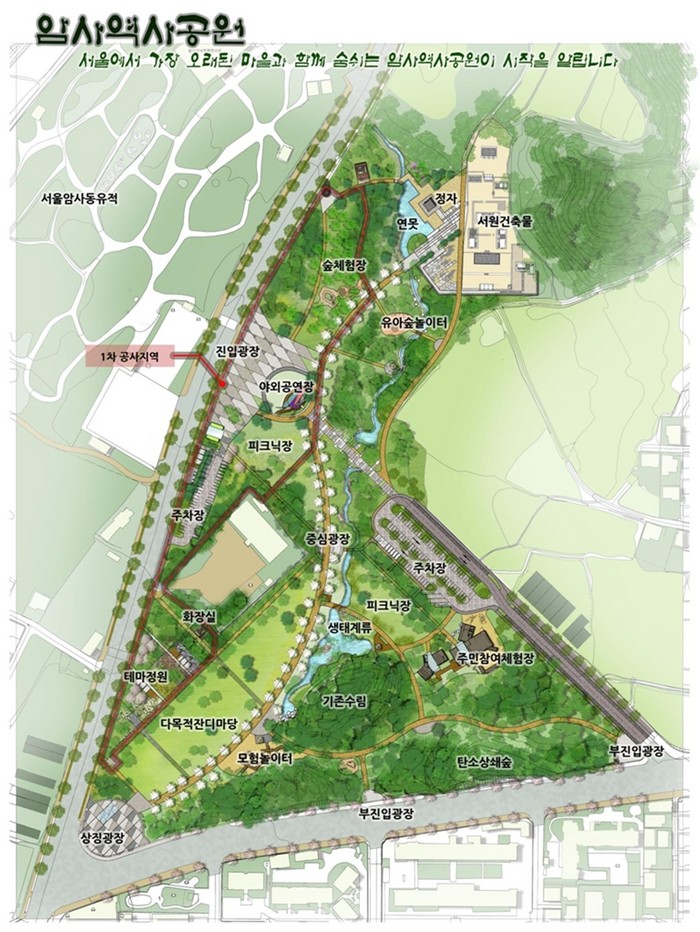 이번에 공사를 추진하게 될 지역은 서울 암사동 유적 앞 암사동 137-2번지 일대로, 부지면적은 22,930㎡이다. 이 부지에는 야외 공연장과 숲체험장, 주차장, 테마정원이 조성될 예정이다. 구는 이를 위한 실시설계를 지난 10월 완료했으며, 12월부터 공사를 착공해 내년 6월까지 완료할 계획이다.