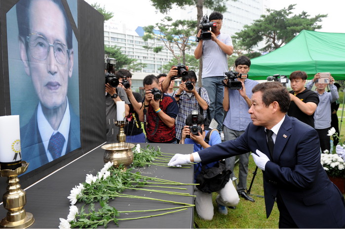 [광주=부자동네타임즈 손권일 기자] 윤장현 광주광역시장은 23일 오전 시청 시민숲잔디광장 내 평화의소녀상 앞에서 열린 독립운동가 후손 고(故) 최현열 선생 민주사회장 노제에 참석해 추모를 하고 헌화했다.