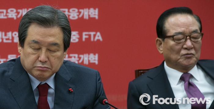 | △ 김무성(왼쪽) 새누리당 대표와 서청원 최고위원이 10일 오전 서울 여의도 국회에서 열린 최고위원회의에 참석해 눈을 감고 생각에 잠겨 있다. <사진제공=포커스뉴스> |