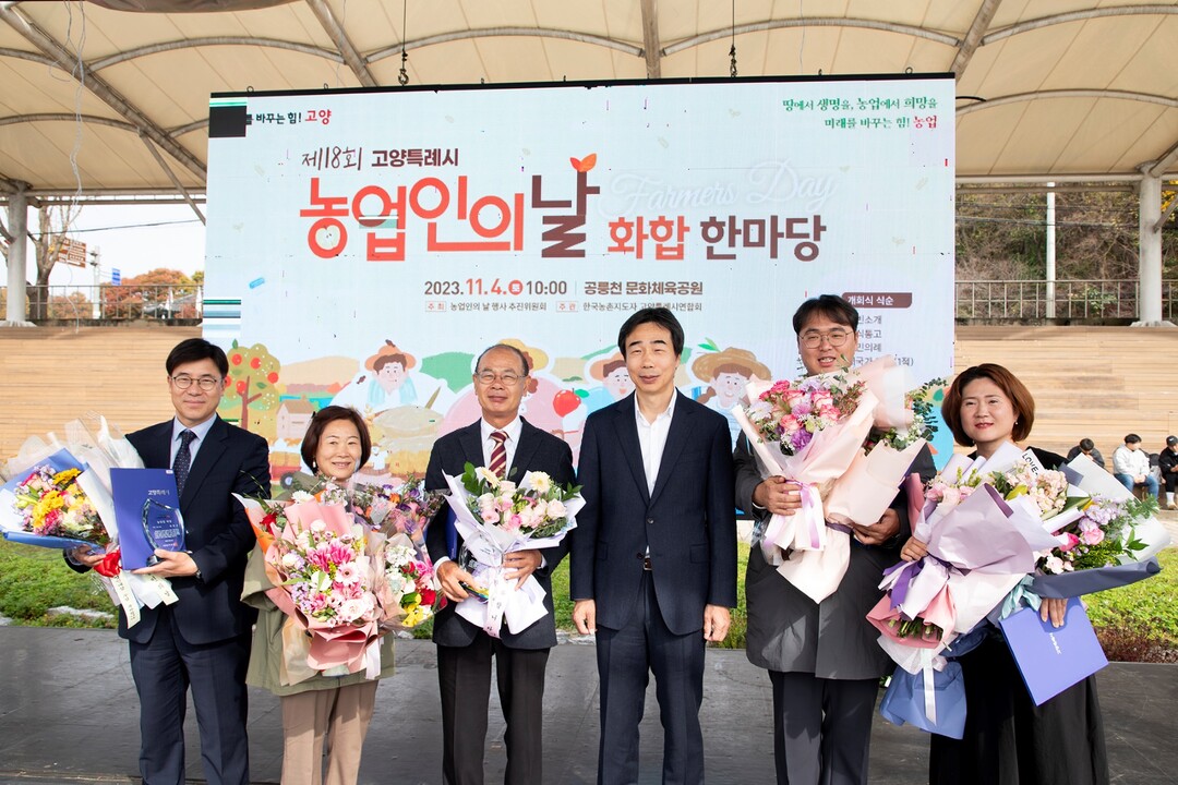 풍물놀이 한마당과 풍물공연으로 흥겹게 시작한 이번 행사에서 고양시 농업 발전과 지역 사회에 공헌한 농업인을 위한 ‘2023 고양시 농업인대상’ 시상도 진행됐다. 이날 ▲고품질 쌀 생산 부문 이재익 ▲화훼 부문 권기현 ▲축산·수산 부문 정재근 ▲친환경·신기술 부문 기세헌님 ▲여성농업인 부문 김선란이 수상의 영예를 안았다.