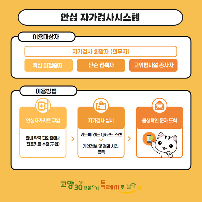 ‘안심 자가검사시스템’은 안심카, 안심콜, 안심숙소, 최근에는 안심 방역패스까지 선보인 ‘고양시 안심시리즈’의 새로운 버전으로, 자가검사키트의 검사결과를 제3자도 확인 할 수 있도록 고안된 시스템이다.