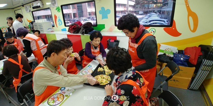 △푸드트럭 행사에 타운 회원 뿐 아니라 지역사회 독거노인, 자원봉사자 등 노인들이 참석하여 식생활개선교육을 받고 약선피자, 건강차 등을 함께 만들며 요리체험의 시간을 가졌다