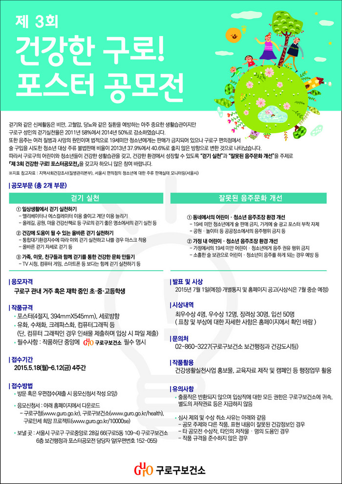 [부자동네타임즈 심귀영 기자] 구로구가 내달 12일까지 관내 초·중·고등학생을 대상으로 ‘건강한 구로! 포스터 공모전’을 개최한다.