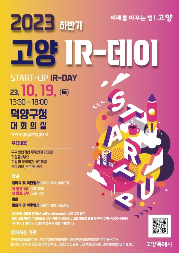 [부자동네타임즈 김인수기자] 고양특례시가 10월 19일 덕양구청 대회의실에서 ‘2023 하반기 고양 아이알(IR)-데이’를 연다. 시는 8월 1일부터 8월 28일까지 39개사가 참여를 신청해 치열한 경쟁이 예상된다고 전했다.