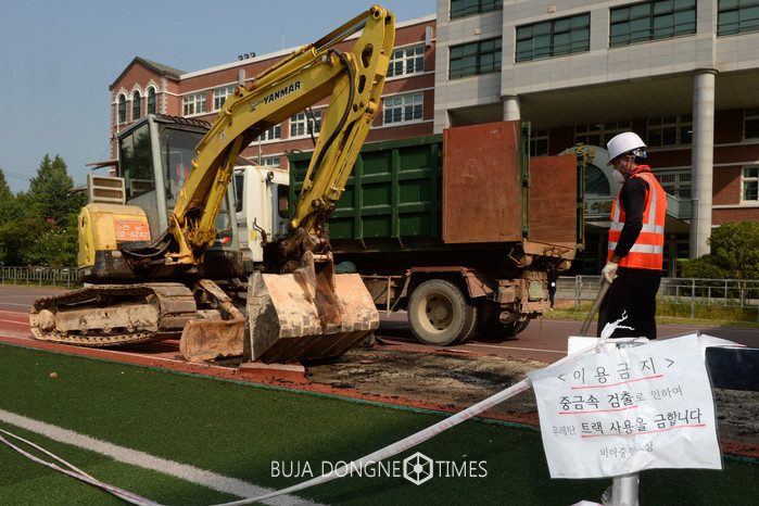 비아중(교장 박하진)으로부터 4일 철거요청공문을 받은 광산구는, 이날 발빠르게 작업에 들어가 우레탄 트랙 841㎥를 걷어냈다. 이 트랙은 시 교육청 검사결과 기준치보다 약 7.7배 높은 ㎏당 691㎎의 납이 검출된 바 있다.
