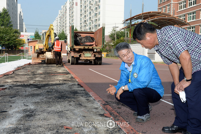 트랙을 걷어내고 남은 깊이 약 1.5㎝ 빈공간에 광산구는, 곧바로 학교 측과 논의를 거쳐, 부직포·마사토 시공 등 기본적인 안전장치도 마련해 주기로 했다. 교육부와 시 교육청에서 재원을 확보해 재시공하거나 새 운동장을 마련할 때까지 학생들의 안전을 확보하기 위해서다.