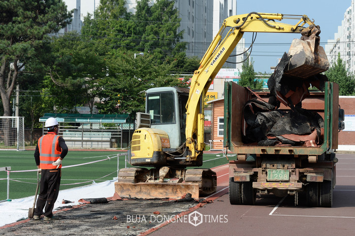 △광주광역시 광산구가 비아중학교를 시작으로 최근 중금속인 납 기준치를 초과해 학생건강 위협, 주민 불안 등을 야기한 학교 탄성포장재(일명 우레탄 트랙) 철거에 들어갔다