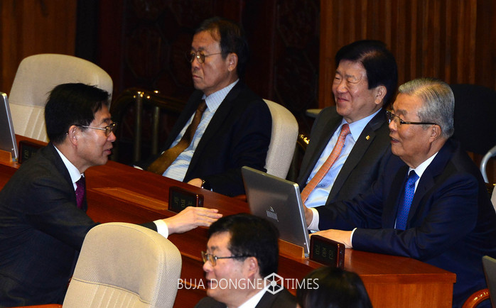 6일 오전 서울 여의도 국회 본회의장에서 열린 제349회 국회 본회의에서 더불어민주당 김종인(오른쪽) 전 비대위 대표가 양승조 의원과 이야기를 나누고 있다. 2017.02.06.